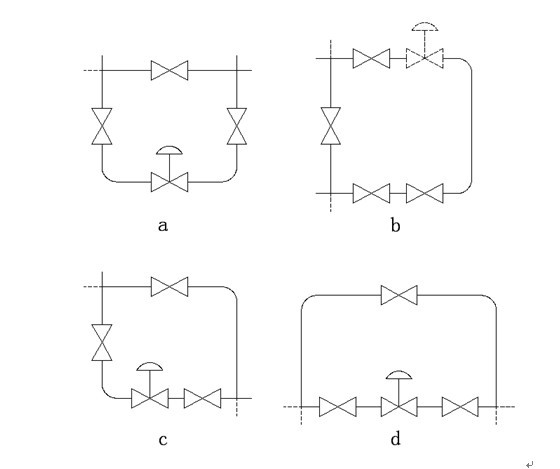 图三a.用于控制阀后压力调节的调压阀,阀的作用方式为压闭型。其原理如下:介质由箭头方向流入阀体、经阀芯、阀座节流后输出。另一路经冷凝器(介质为蒸汽时使用)冷却后,被引入执行机构作用于膜片上,使阀芯随之发生相应的位移,达到减压、稳压之目的。如阀后压力增加,作用于膜片上的力增加,压缩弹簧,带动阀芯,使阀门开启度减小,直至阀后压力下降到设定值为止。同理,如阀后压力降低,作用在膜片上的力减小,在弹簧的弹力作用下,带动阀芯,使阀门开启度增大,直到阀后压力上升到设定值为止。
