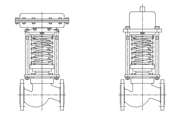 图三b.用于控制阀前压力的调压阀,阀的作用防守为压开型。其原理如下:介质由箭头方向流入阀体,另一路经冷凝器(介质为蒸汽时使用)冷却后,被引入执行机构作用于膜片上,使阀芯随之发生相应的位移,达到泄压、稳压之目的。如阀前压力增加,作用于膜片上的力增加,压缩弹簧,带动阀芯,使阀门开启度增大,直至阀前压力下降到设定值为止。同理,如阀前压力降低,作用在膜片上的力减小,在弹簧的弹力作用下,带动阀芯,使阀门开启度减小,直到阀前压力升到设定值为止。